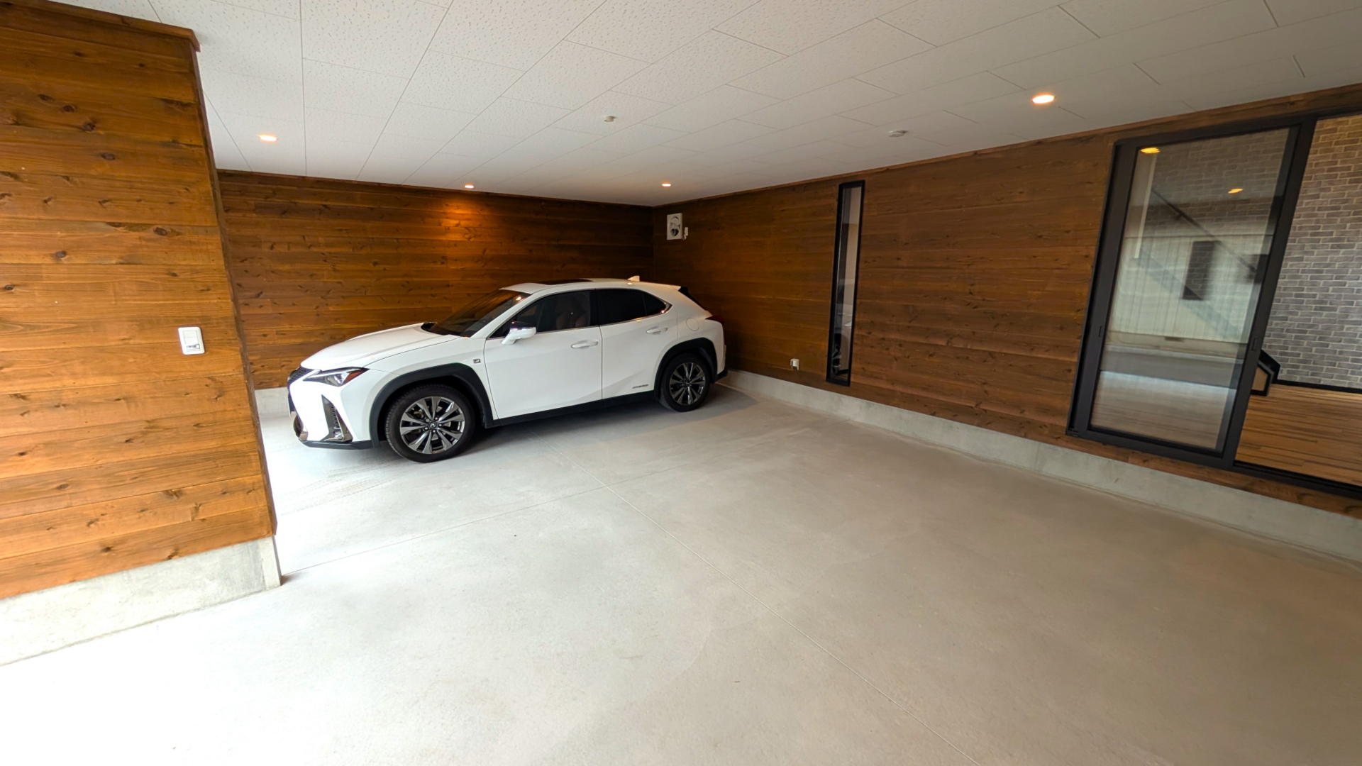エアコン付きの室内ガレージ空間には、自動車を最大3台駐車でき、リモコン電動シャッターを2基装備。