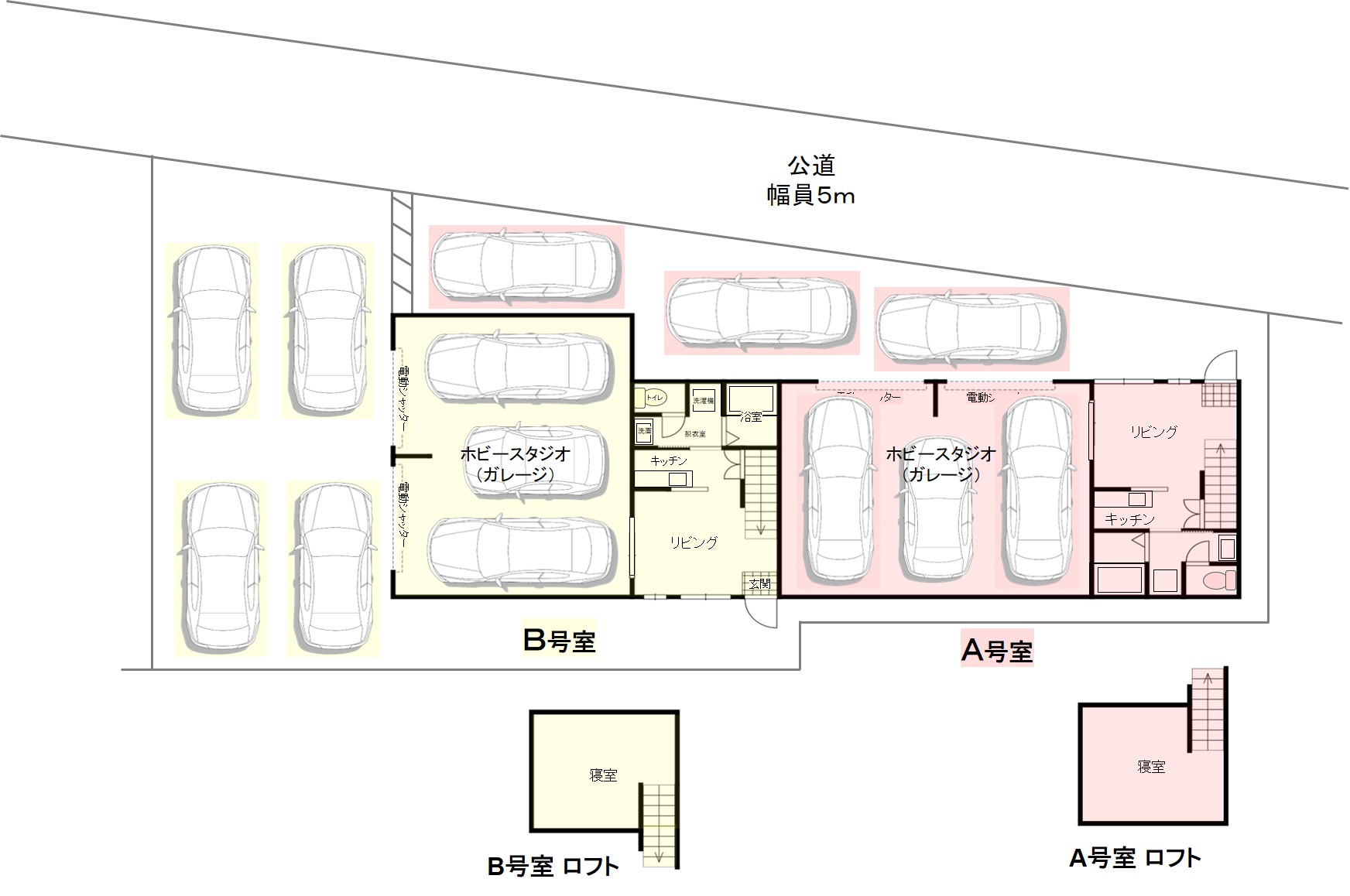 - ガレージ内寸法:幅 7.735m × 奥行 5.915m(A/B共通)